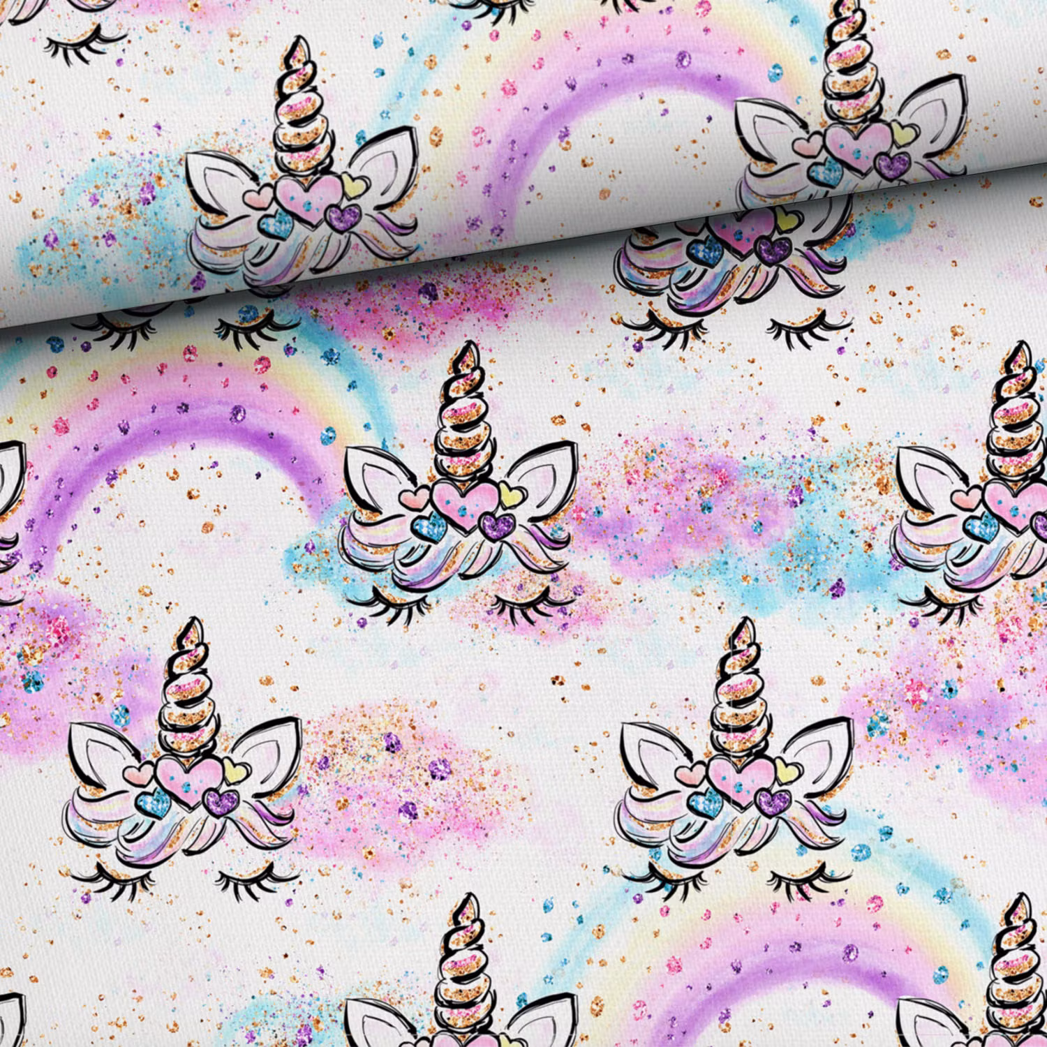Ett mjukt, stretchigt trikåtyg med tryck av enhörningar, regnbågar och moln.