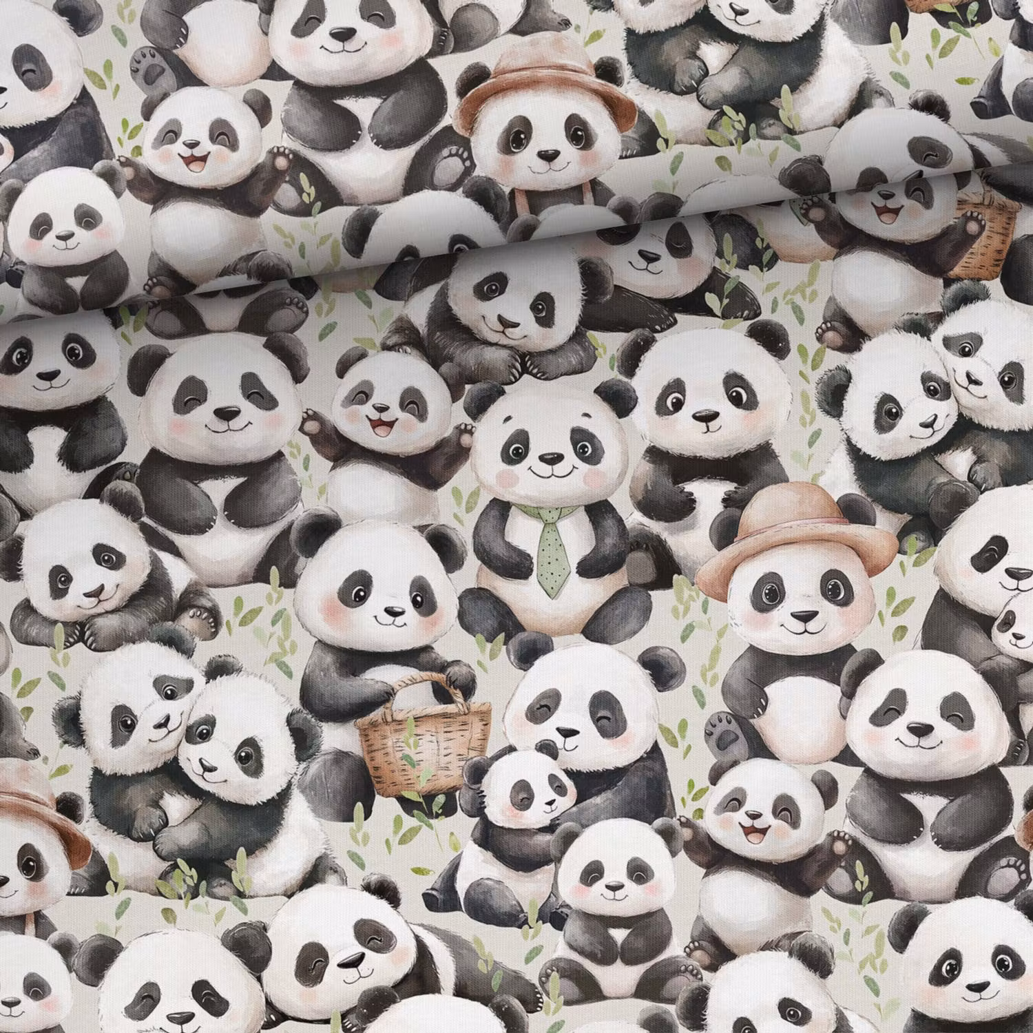 Ett mjukt, stretchigt trikåtyg med tryck av söta pandor.