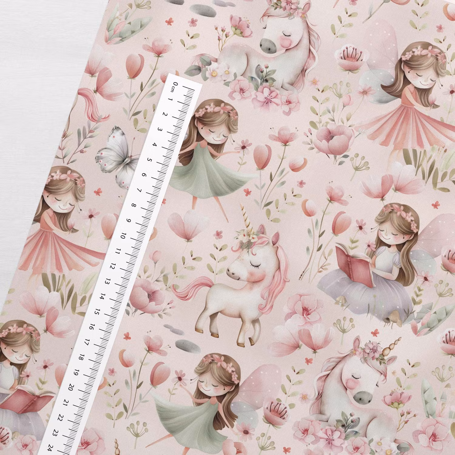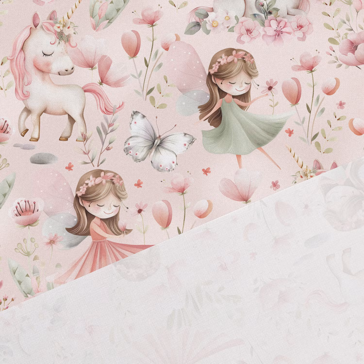 Ett mjukt, vävt bomullstyg med tryck av älvor och enhörningar med ljusrosa bakgrund.