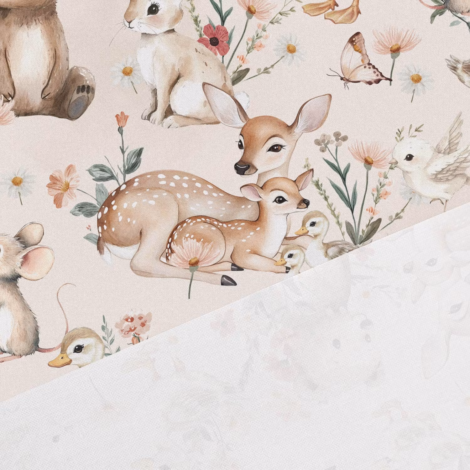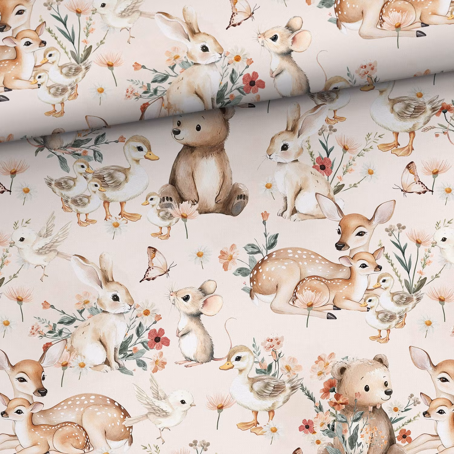Ett mjukt, vävt bomullstyg med tryck av söta björnar, rådjur, kaniner och möss bland vackra blommor.