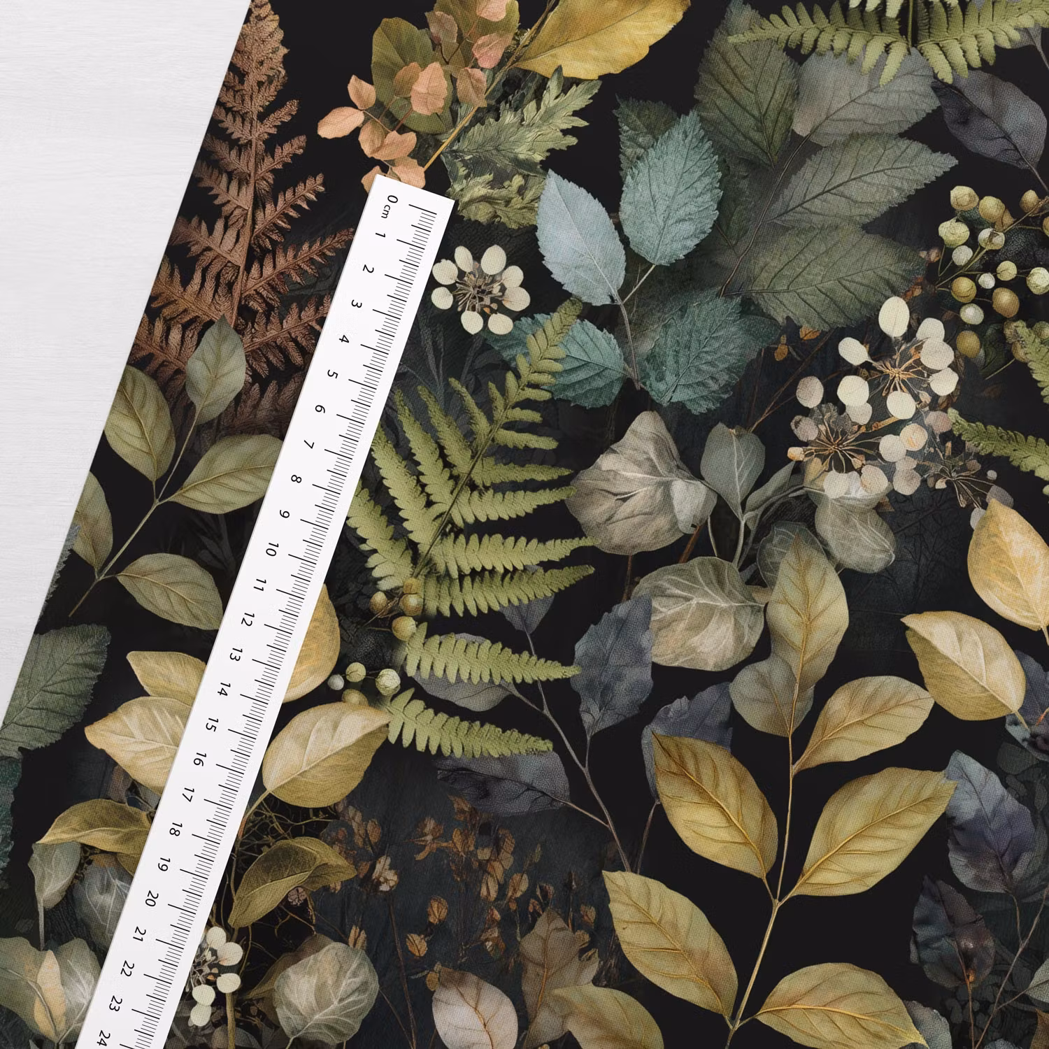 STUV 39 cm - Mjukt vävt bomullstyg med tryck av skogsblad med mörk bakgrund. Perfekt för kläder och barnrumsinredning.
