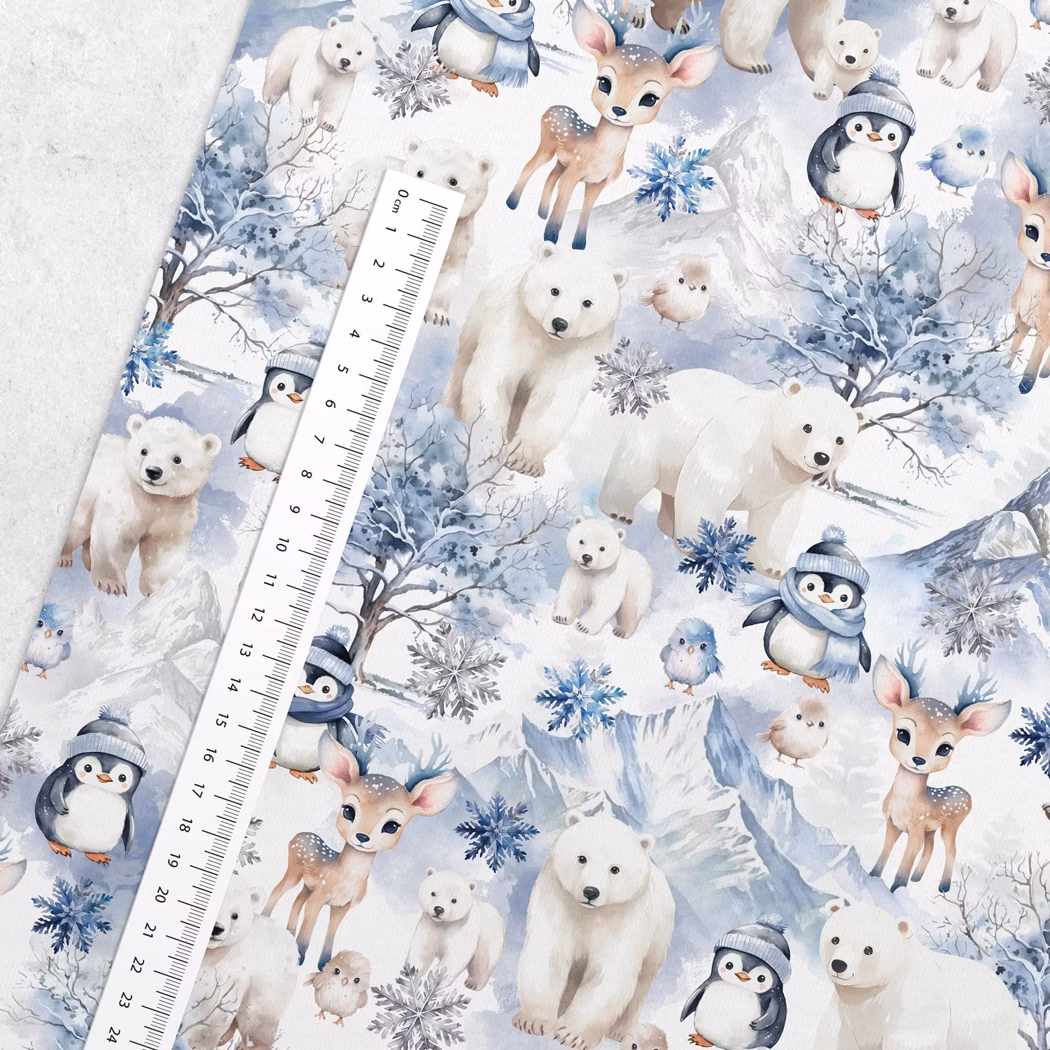 STUV 40 cm - Ett mjukt, stretchigt trikåtyg med tryck av söta djur i snö. Perfekt för att sy fina bodys, byxor, pyjamasar, dregglisar och mössor av.