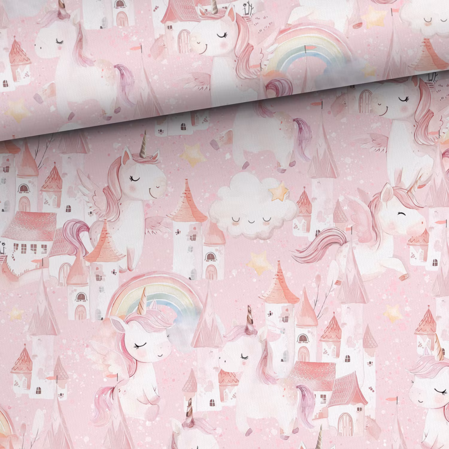 Ett mjukt, vävt bomullstyg med tryck av söta enhörningar, slott och regnbågar med rosa bakgrund.