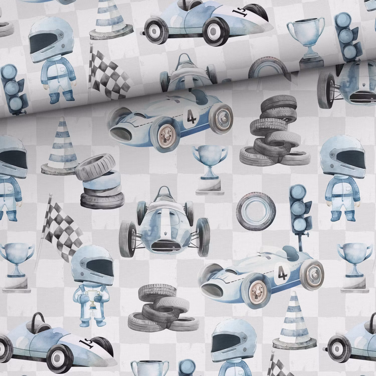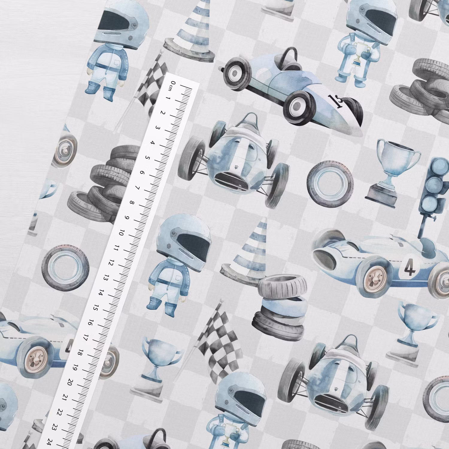 STUV 41 cm - Ett mjukt, stretchigt trikåtyg med tryck av racerbilar med ljus bakgrund. Perfekt för att sy fina t-shirts, toppar, klänningar, bodys och mössor i