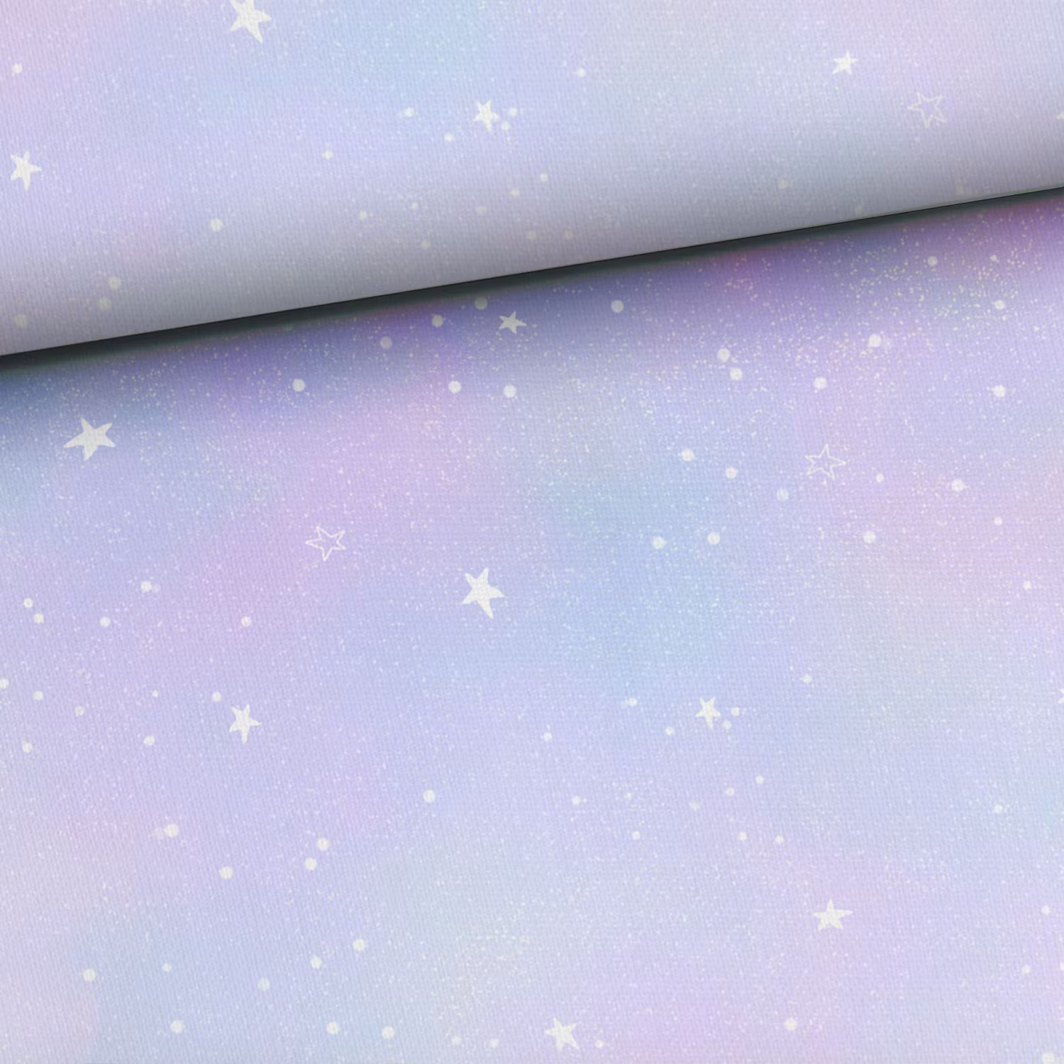 Ett mjukt, stretchigt trikåtyg med tryck i lila med små vita stjärnor.