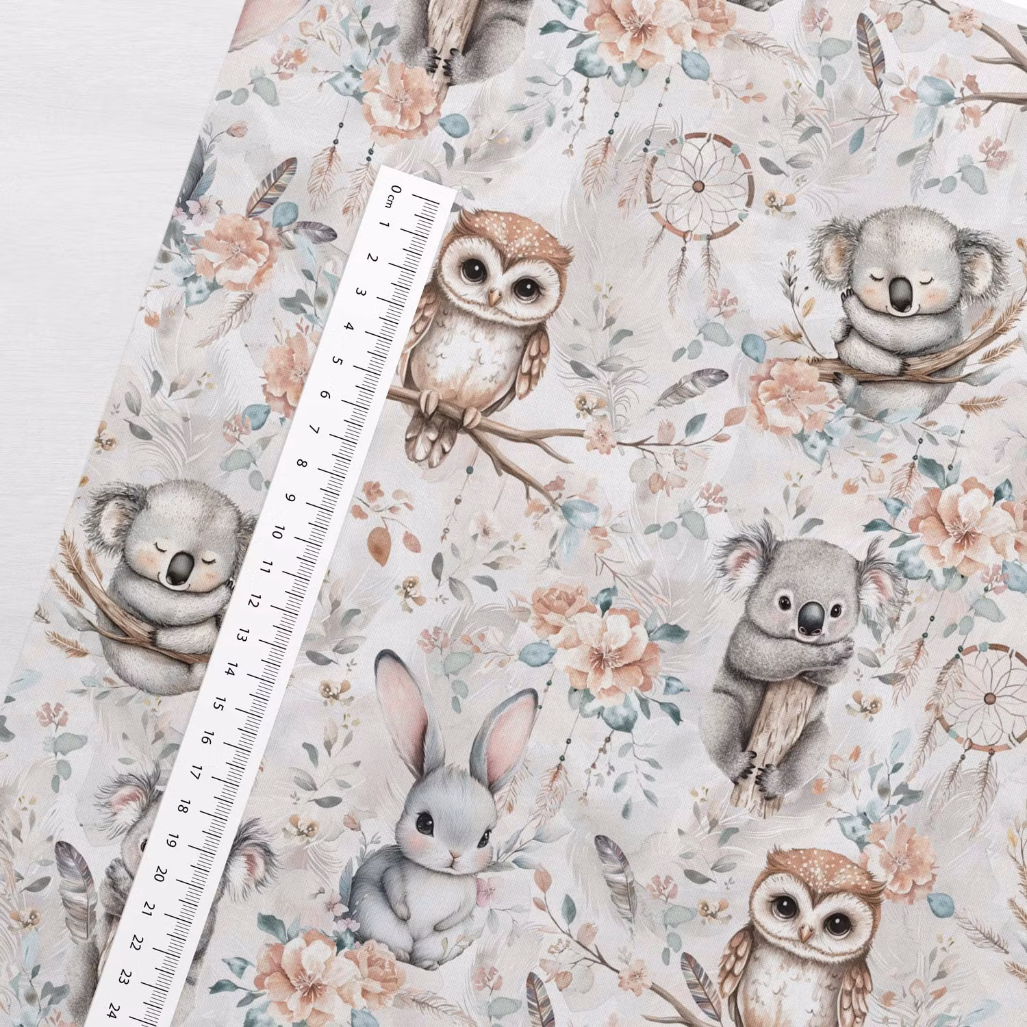 Ett mjukt, vävt bomullstyg med tryck av vackra ugglor, kaniner, koalor och drömfångare.