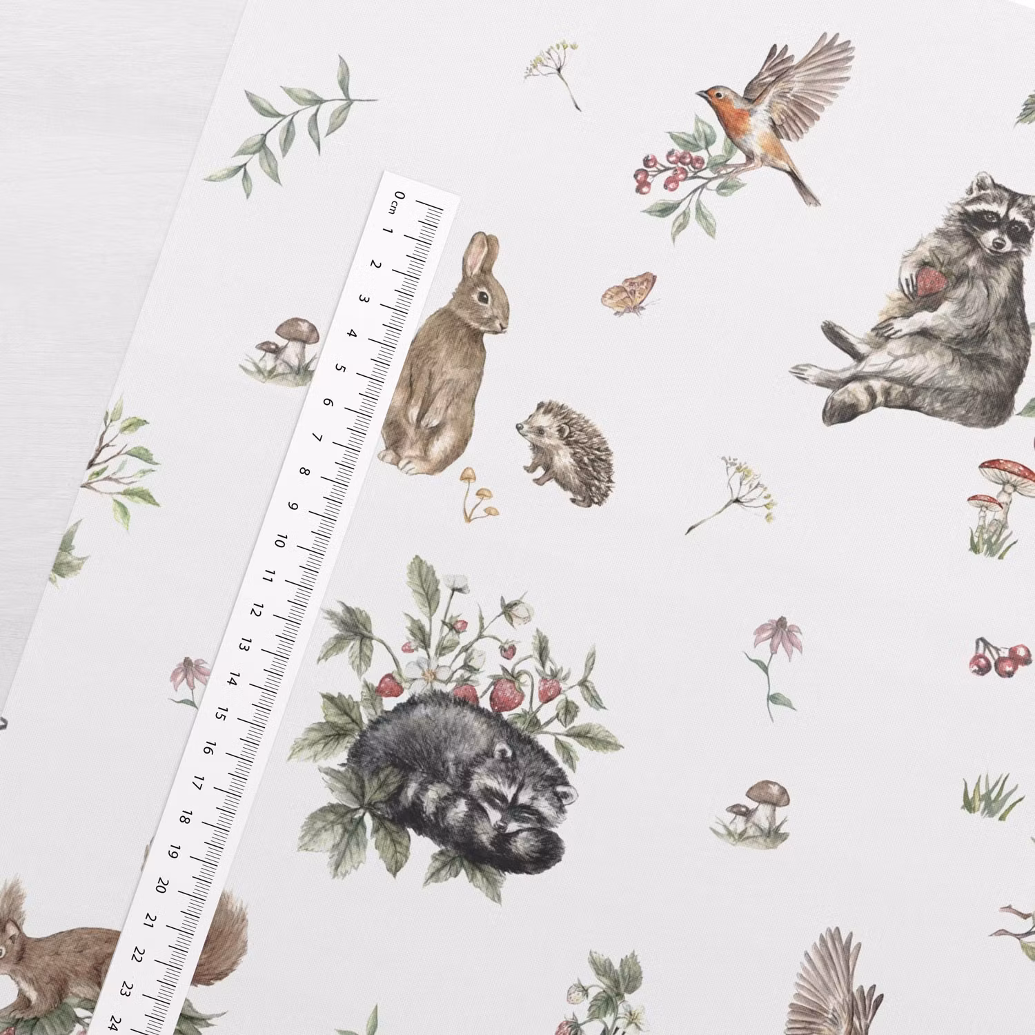 Ett mjukt, vävt bomullstyg med tryck av tvättbjörnar, kaniner och ekorrar på vit bakgrund.