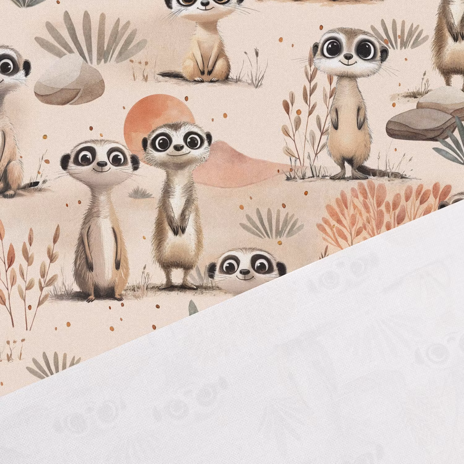 Ett mjukt, vävt bomullstyg med tryck av nyfikna surikater.