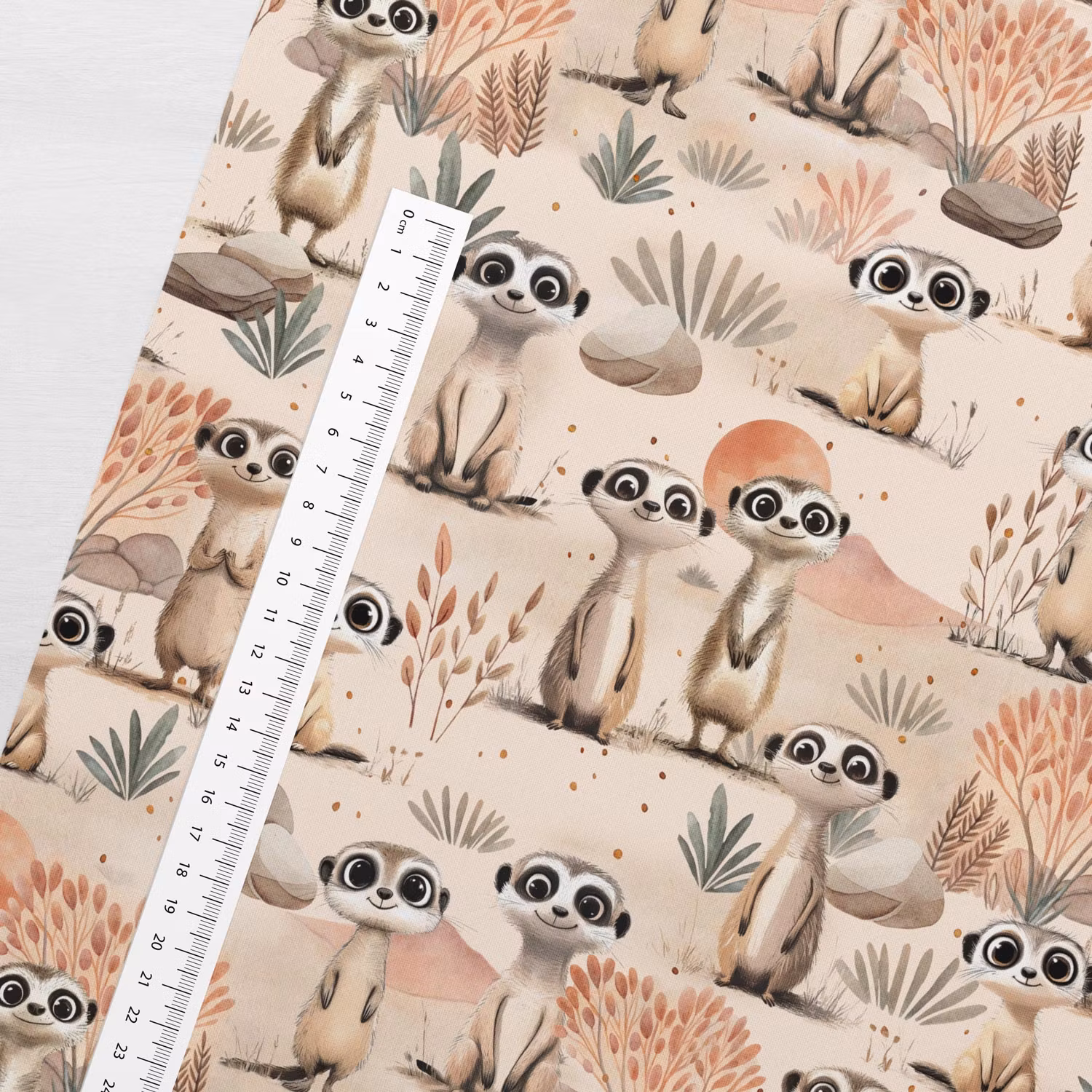 STUV 41 cm - Mjukt bomullstyg med tryck av nyfikna surikater. Perfekt för kläder, inredning och pyssel.