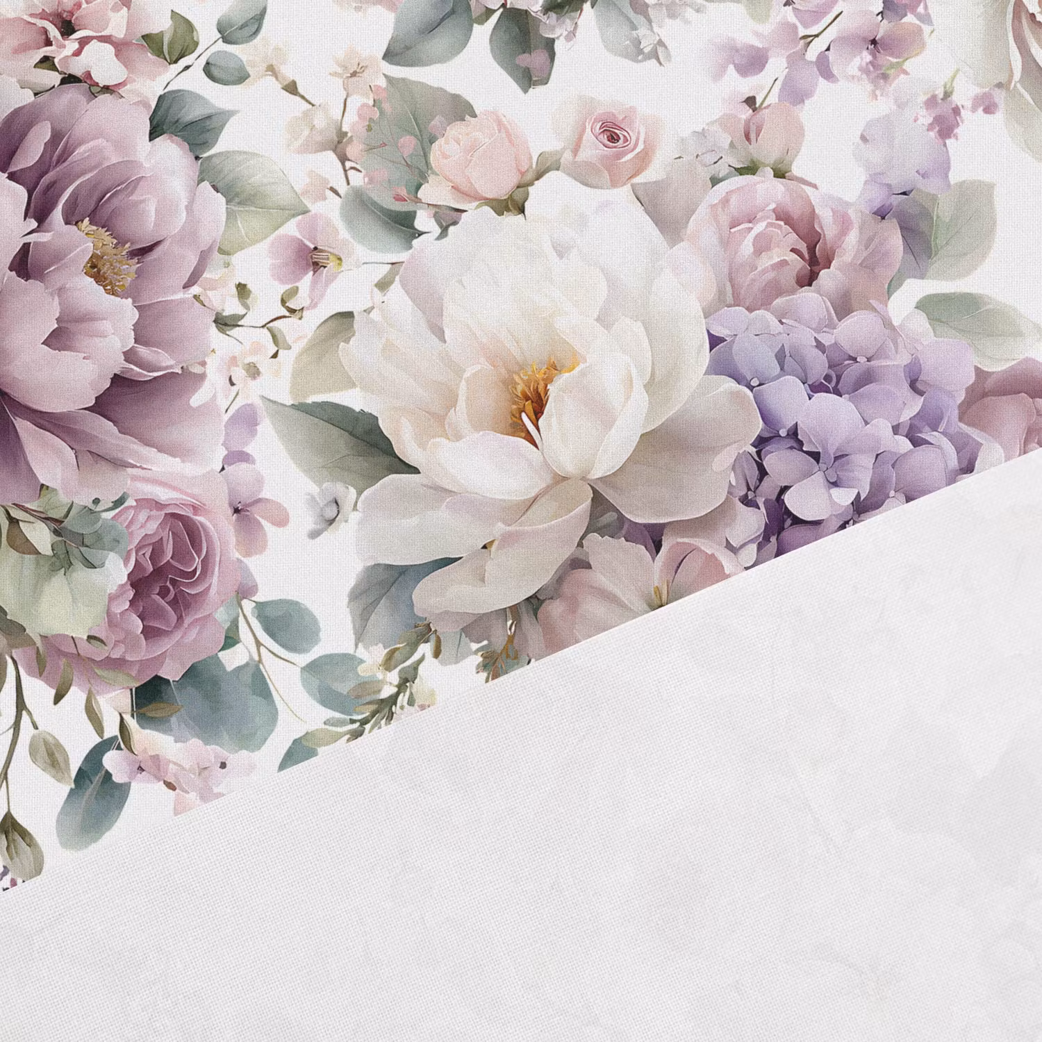 Ett mjukt, vävt bomullstyg med tryck av vackra pioner i lila nyanser.