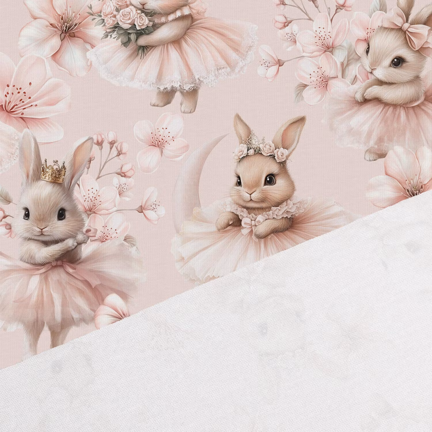Upptäck vårt mjuka och stretchiga jerseytyg med tryck av kaniner och blommor i ljusrosa - perfekt för bekväma klänningar, leggings, toppar, tunikor och pyjamasar.