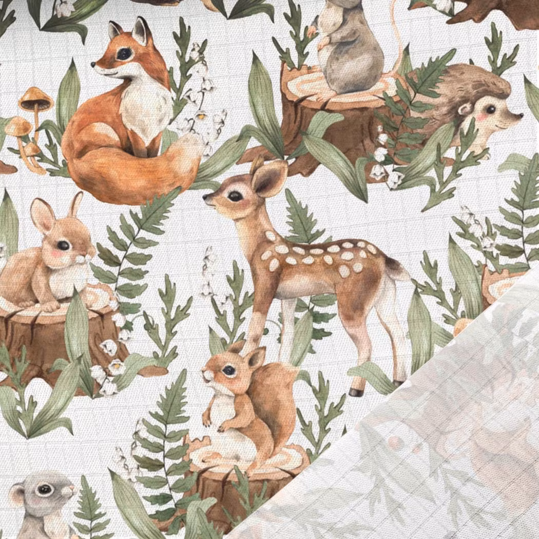 STUV 75 cm - Ett supermjukt och tunt bambutyg med tryck av skogsdjur på vit botten. Passar perfekt för sömnad av lätta babyfiltar och swaddlefiltar.